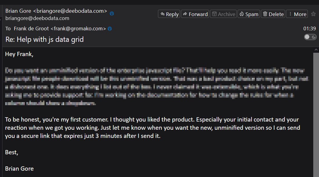 Brian Gore works for Bank of America by day and moonlights as a peddler of essentially undocumented Javascript components on the side. It's unclear where he obtained their source code from. His extremely expensive "support" is apparently done in his employer's time. Brian charged us $400 to tell us to add an extra "<script> tag to get his grid working - his site has no examples of any kind but deceptively links to "documention" and "examples", where one lands on the sameidentical page with a few snippets of code that does not run. None of the functionality of the components is provided. No examples, no API/function documentation, no Help file - nothing. The online recommendations to use his "absolutely perfect" grid apparently are just "driveby spams" by himself. Not a soul mentions any of them online but those one-liners. He refused to honor his 7-day money-back guarantee, even when we said he could keep the price of the actual component which we wouldn't be using - we'll use AG-Grid instead. Absolutely not he insisted - "I already provided the integration support." So no $400 refund for a year of integration support, since he'd already told us to use two tags instead of one. GOTCHA! We lost $449 on what is essentially a scam. Not honoring the 7-day refund guarantee is the same as larceny, unjust enrichment, theft, fraudulent obtaining of the money - making Brian Gore a thief, a criminal.